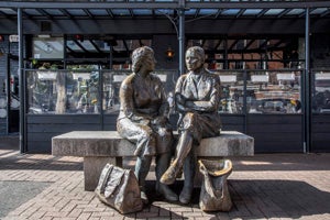 Just at the North side of Ha'penny Bridge, at the end of Liffey Street, two women have sat down for a chat in the middle of a busy day's shopping, their bags at their feet. Situated in one of Dublin's most popular shopping areas, one bag is from Arnotts Department Store on nearby Henry Street. Jakki McKenna's 1988 bronze sculpture was designed to reflect everyday city life. Shortly after the sculpture's installation, one of the bags was stolen - quite a difficult feat, given that it was made from bronze and extremely heavy! The bags are now secured firmly to the ground.